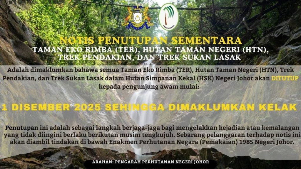 柔佛州森林局今日发表通告提醒,所有州立森林公园、生态森林公园、登山步道、极限运动步道及永久保留森林,从12月1日起,将暂停对外开放,直至另行通知为止。