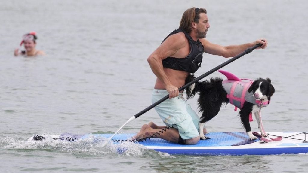 英国南海岸城市普尔昨(27)日举办英国狗狗冲浪锦标赛。狗狗及其主人将位于布兰克索姆·丹尼·奇恩海滩角逐“英国年度狗狗冲浪冠军”的称号。这场趣味十足的活动将桨板运动、狗子和热情的主人结合在一起,打造了一场轻松愉快的比赛。