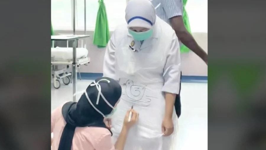 一名医生在医院病房,即兴在一名护士的围裙画上小鸭与池塘的可爱涂鸦,瞬间唤起许多网民住在医院期间的温馨回忆,获得热烈回应!