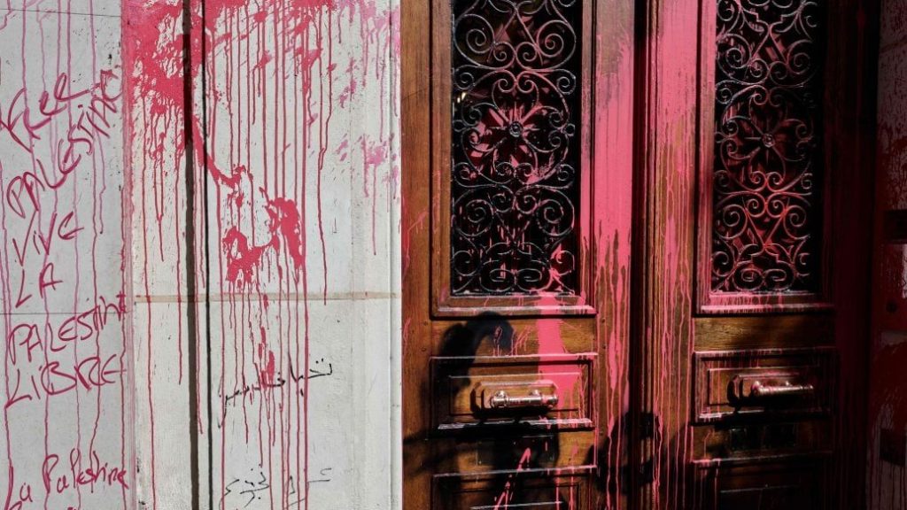 以色列航空公司(E1 L1)的巴黎办公室门口遭人以红漆涂鸦并写上挺巴勒斯坦的标语。以色列今天敦促法国当局对这起“野蛮行径”采取行动。