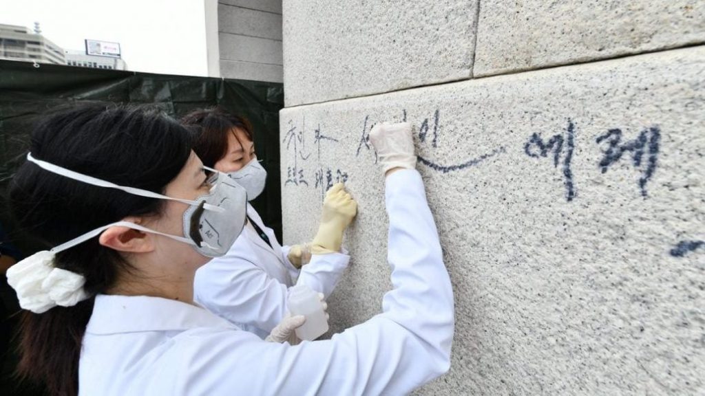韩国著名古迹景点景福宫石墙日前再遭涂鸦。一名79岁男子周一在景福宫的光化门石墙上涂鸦,写下“致国民与全世界人民的信”“特朗普总统”等字样,目前相关人员已清除完毕,该男子也被进行紧急住院处置。而涂鸦事件再次引发了对文化遗产保护的关注。