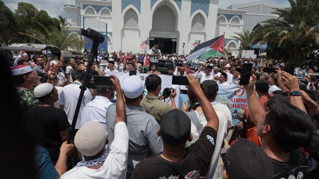 约2000名彭亨州民众聚集在彭亨州苏丹阿末沙清真寺,为全球坚韧船队志愿者遭扣押一事展开声援行动。