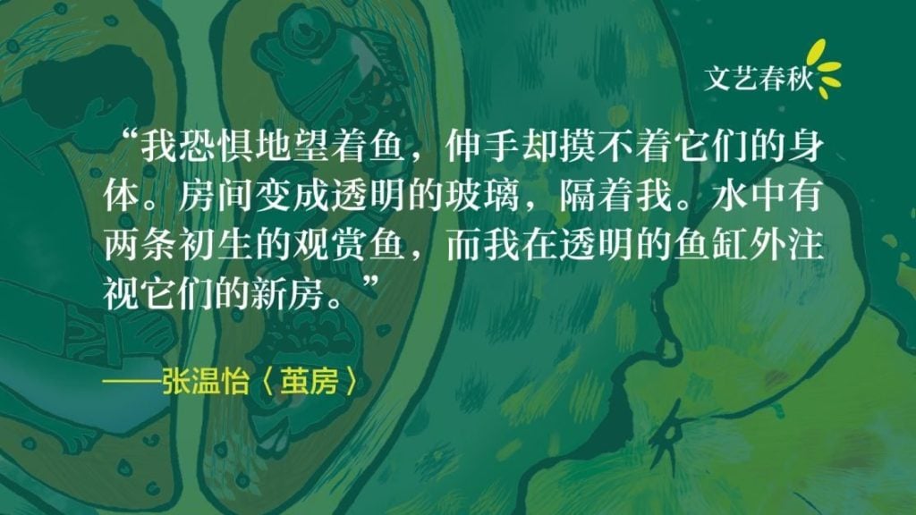 村口小径有一间老屋,具体来说那不是像样的屋子,只是小巧的木房间。我对老妇的印象停留在那里。 傍晚烈阳还睡,骑着脚踏车来回玩耍,常将老妇的单人房子作为定点。老妇饲养一只大狗,听说它在村子流浪十余年,后来便守在她家里。每日按餐喂食。她开着小木门围篱(那时还有围篱)大狗就睡在那里,邀请我进入她家与狗玩耍。伸手触摸狗的头,软软的,暖色系的毛发如阳光温和。大狗摇摇尾巴,伏下身体缓缓坐下让我摸头。老妇彼时已出现瘫痪症状,她的房子只有卧室的大小,里边有一张床褥和被子,小小竹藤两格抽屉,上面摆放餐具和杯子。床头还有包装狗粮,伸手便可触及的距离。 昏暗的房间并没有多少人经过。偶尔,我会看见一个瘦小的印尼工人,提着打包的塑料袋装着软糯的食物给老妇。她孱弱地接过食物,糊状的米饭和淡黄色的汁水像极她无色无味的生活。我看着她吃东西时无神的模样,垂头对着木质地板,有时盘坐在床头看向窗外。 阳光照进房间时让我产生某种错觉。 眼前的老妇化为一株枯树。她就这样等待某种生命进来房间,望着窗外偶尔经过的摩托车和狗儿,或是火鸡追着路过的小孩把这里割成两个世界。 每当我经过这里望着老妇,总误以为她是一道无声的风景,别的世界派来观察我们一举一动的监视者。 我也无意走入这道风景。像是一场电影,我从老妇身旁望着她孤独地吃着粥食,然后看见碗里的食物残余,被印尼工人收拾后都丢到屋后的沟渠。流浪狗或蜥蜴在附近觅食,而它们也误入老妇的片场,吃着老妇剩余的食物充饥。那时的我还没上幼儿园,记得有这么一个老妇,还有一些客串的小演员、物件和不知名的东西。 每次老妇就静静看着我和狗,有时低声问话:“吃饱了吗?”“刚放学吗?”“功课做完了?”我点头答应,对话仅有简单的语助词。老妇银发铺头,小眼合上。下午明明很热闹,她卧在客厅,睁眼的时候露出一双灰白的眼眸,听不见周遭的背景声。起先,老妇话不多,看着她犹如微小变化的默剧电影,后来进化成静态的照片,周围的声音熙熙攘攘,唯独她依旧安静地躺在残破的木房,连同床铺缩成一个小小的盒子。 她卧在客厅一动不动的,看不见我,也听不见声音。盒子消失以后,周围的人不再提起枯木般的她。小小的我,不知道死为何物,以为所有像老树的生命都只是迁移至适合居住的地方。 而我,还有房间,从那时就定下某种奇怪的连接。 房间是随心变幻大小的空间。 一个人住的时候才是真正的房间。或大或小,一张睡床或地铺草席也能构成房间。 时光拉扯影子和脊椎,毕业后我如常寻找一个小巧的房间。做一个除了呼吸、睡觉、吃饭的生物外,还有记得自己是一个活着的普通人,窝在一间10平方大的房间。床喂养我的梦境,躺下去,很久很久都无法从梦中醒来。 有时梦见自己变成动物,或被动物追赶,困在一个幽闭无比的房间。 一次,我梦见自己变成孕妇,挺着硕大的肚皮从荒野青草,被一头水牛追赶,逃进一间房间。房间很暗,伴随着雾水,肚子一下子消瘦,诞生两条半透明的幼鱼。 鱼在房间游泳,半透明蝌蚪状的身体,眼珠忽转向我,摆动尾巴慢慢往前游。我恐惧地望着鱼,伸手却摸不着它们的身体。房间变成透明的玻璃,隔着我。水中有两条初生的观赏鱼,而我在透明的鱼缸外注视它们的新房。 梦醒,床湿成一片。窗外有只傻鸽子拍打翅膀,看着我做梦,清醒。 很像去了远方,而又回到原点。我后来很少社交,上班后和同事之间毫无话题,平日只忙工作,回家就休息。偶尔,我会回家看看家人,还有轻微失智的爸爸。 爸爸自我念大学的时候,很少说话。后来搬到新家,有了自己的房间,每天他都在房间里睡觉,看视频,对着小小的手机屏幕唱歌。除了睡觉吃饭,一直都在唱歌。 房间里的爸爸什么也听不见。 爸爸吃饭,爸爸。 我叫了好几声。爸爸没理我。 音乐停止后,没人知道爸爸在房间里做什么。客厅里到处都能看见女孩子的头发。褐色、红色、黑色……都是长发,一些是我掉的。发丝之间缠成一圈又一圈,有一根小指的厚度。有的缠住灰尘。沙发没有位子,坐的都是堆积的衣服。有人睡在衣服上,当枕头。 每天半夜,饭桌有窸窸窣窣的声音,讨论爸爸,讨论每日重样的晚餐。这星期番茄鸡、下星期绿豆粥、再来番茄鸡、绿豆粥…… 家里只剩下房间可以安静下来。只有房间地板没有灰尘,也只有房间可以睡觉,可以安静。 爸爸或许是自愿安静,变成一只薄薄的虫子,未脱壳,背着一个沉重的外壳活在这里。 新住处的墙上到处都是衣虫。它们贴在墙上,一动也不动。 爸爸,可以下车咯。 爸爸看着我好久,眼神呆滞。向左,向右了,他仍在左。 爸爸背着沉重的壳活在这里。用餐时,他盯着眼前的食物发呆,板着脸,没有表情。咽了几口饭,菜只吃了一些,然后离开餐桌。 走走,吃饱了就走走。 而他只敢近距离走。望着爸爸,那时已经是晚上,路灯昏黄打在他的半张脸,我看见那双眼,从那一刻清楚看见,眼睛里边装满水,有鱼缓缓游动。 爸爸用那双半透明的眼珠回望我。 后来的我真的害怕凝视爸爸的脸。曾经的巨人爸爸从我的梦里预示中游走,眼里装满水。我不敢再看。他背着很重的壳出现在我眼前,说很怕冷,去到哪里都想回家。回到房间,回到睡床。 而我看着他,薄薄的身躯,化作一只随时被风吹走的衣虫。到哪里都有自己的房间,听不见有人和他说话。重