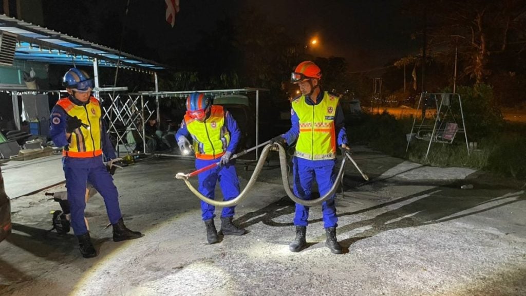 (波各先那28日讯)4公尺长、20公斤重的巨型眼镜蛇夜间闯民宅,可怕! 事件昨晚在波各先那县甘榜武鲁加德拉马一间村屋发生。一条长达4公尺、重约20公斤的眼镜蛇在厨房屋顶内出没,吓坏村民。 村民拍视频上载社媒,有人直呼:“哇!很长!”。拍视频的人也说:“Tudia(表示惊讶),需要出动5个人捕抓。” 哥打士打县民防卫队官员阿都哈立克在文告中说,当局昨晚8时57分接获投报,指有一条大型毒蛇出没。5名队员于晚上9时06分紧急出发,9时19分抵达现场。 他说,抓蛇行动出动多项装备,包括两支捕蛇钩、一支C型钩、一支蛇夹及安全头盔,确保整个过程万无一失。 他提醒,若民众发现毒蛇或其他危险野生动物,应立即联系相关单位,切勿自行处理,以免造成伤害或危险。 民防卫队队员到场捉蛇。(视频截图) 大蛇长达约4公尺。(视频截图) https://x.com/mynewshub/status/1960576200352653618/video/1