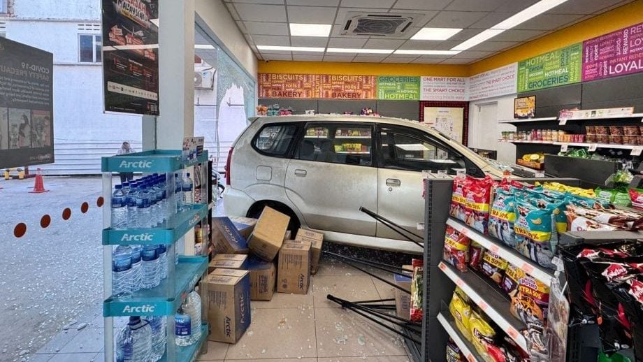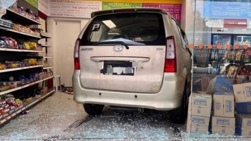 一名华裔老翁在油站买报纸后准备离开时,疑误踩油门,导致轿车飞撞进入油站的便利店,所幸人无大碍。