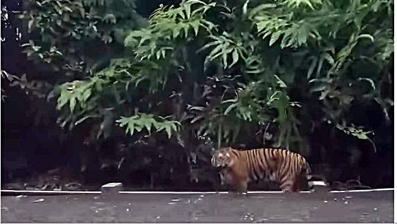 虎口惊魂!小贩驾车路经罗京时,一头老虎却突然横过马路,并挡在他们的车前,让全车人吓呆了!