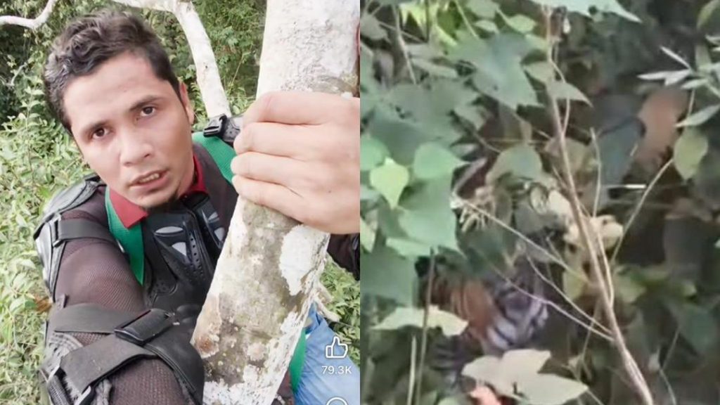 一名男子声称在靠近灌木丛时,疑似意外遇见猛虎,被迫攀上一棵大树避险,前后僵持近4小时,直到猛虎离开才得以脱身。