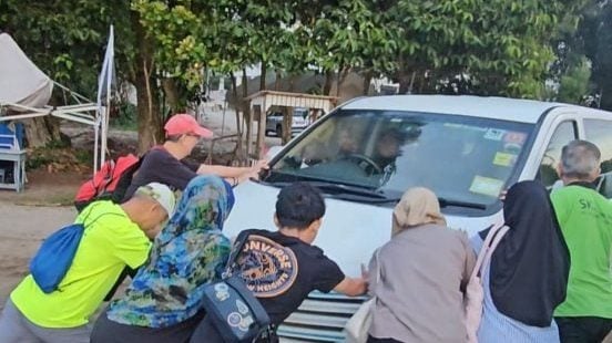 关丹海滩上演一幕“大马精神”温馨场景——各族民众齐心协力,合力推车救援,一同助陷入沙滩的车辆脱困。