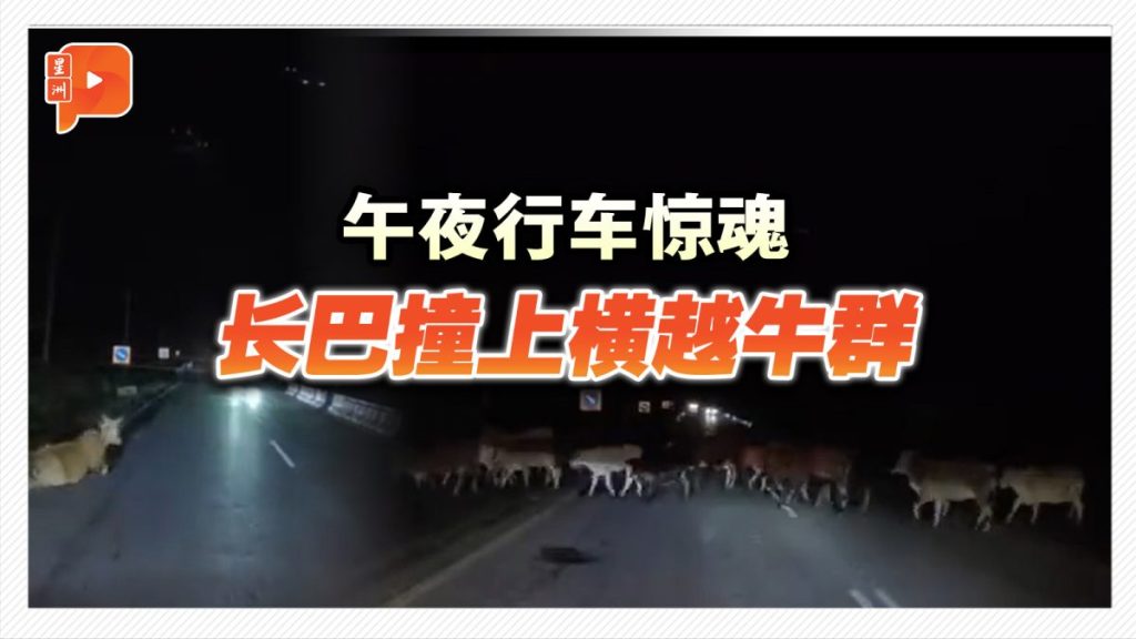 一辆长途巴士在夜间行驶途中,惊险遇上一群横越马路的牛只。司机虽然紧急刹车闪避,但仍撞上数头牛,导致部分牛只被撞飞。