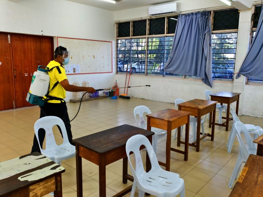 应对全国流感大流行,培民中学采取积极行动,职员定期在校园各楼层包括教室喷洒消毒药水,防止病毒传播。
