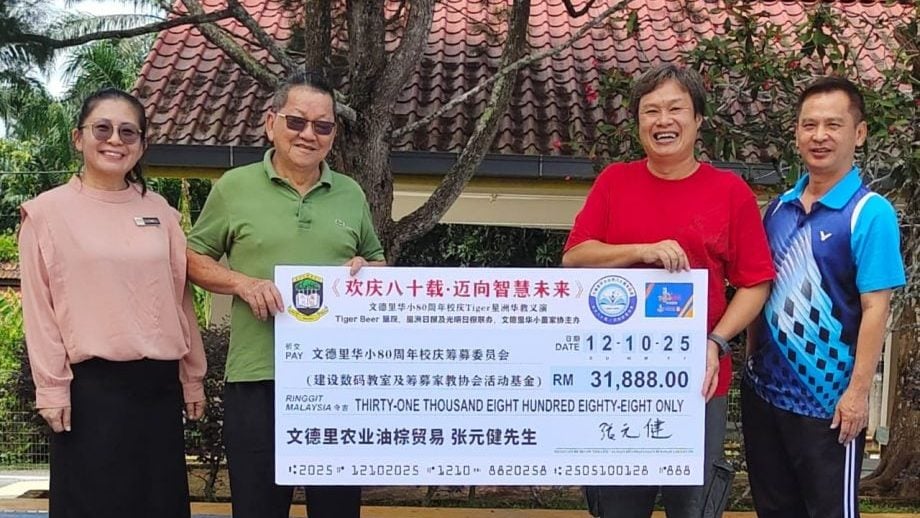 文德里华小80周年校庆Tiger星洲义演获得校友鼎力支持,文德里农业油棕贸易东主张元健捐献3万1888令吉。